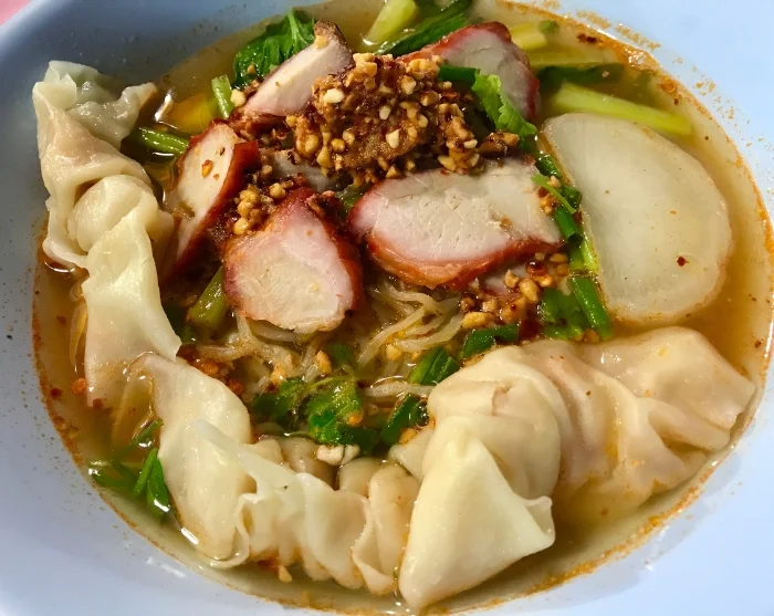 Den första smakupplevelsen är en skål med ”tom yum wonton”, där den klassiska thailändska soppan serveras med fyllda dumplings och bjuder på en perfekt balans av starka, syrliga och aromatiska smaker. Därefter följer du doften av grillspett till nästa stopp, där satayspett med grillat fläskkött tillagas över kol och serveras med en krämig jordnötssås.