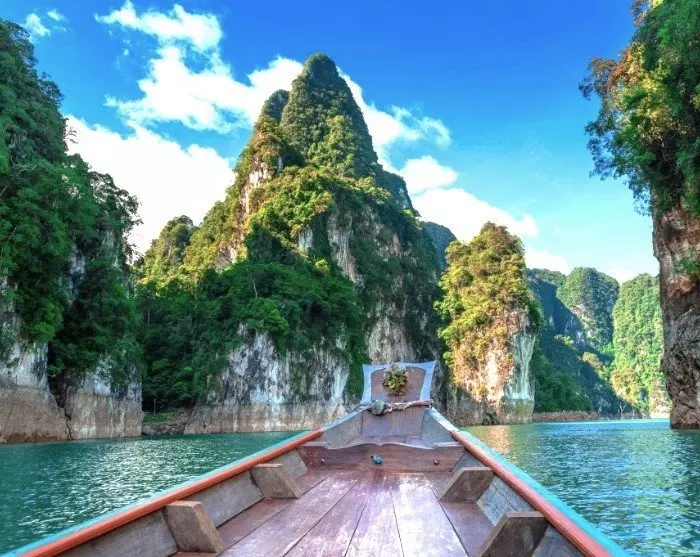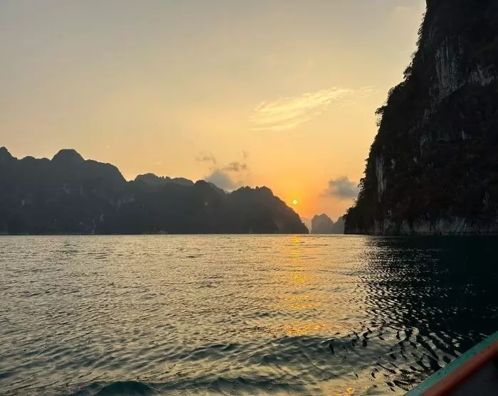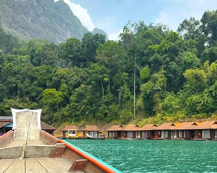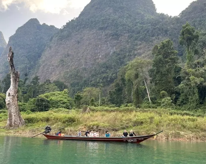 Sedan körs du till Ratchaprapa-piren, tätt inpå den imponerande dammen. Här kliver du ombord på en traditionell träbåt och seglar ut på Cheow Lan-sjön, där du kan njuta av det majestätiska landskapet med de ikoniska kalkstensklipporna.