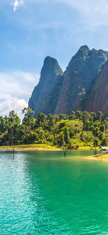 Khao Sok är en av Thailands största nationalparker med en yta på 739 km², och sannolikt också en av de vackraste. Här hittar du ett av landets största områden med urskog – en uråldrig, orörd regnskog som stått orörd i miljontals år. De frodiga omgivningarna och de livgivande floderna är hem åt ett rikt djurliv med bland annat gibbonapor, langurer och makaker. Här lever också den lilla mushjorten, tillsammans med muntjak och serov. Har du riktig tur kan du kanske få syn på den vackra långsvansade marmorkatten. För dig som är fågelintresserad finns det mycket att se fram emot: näshornsfåglar och rödnackade trogoner är bara några av de fåglar som gömmer sig i den täta djungeln.