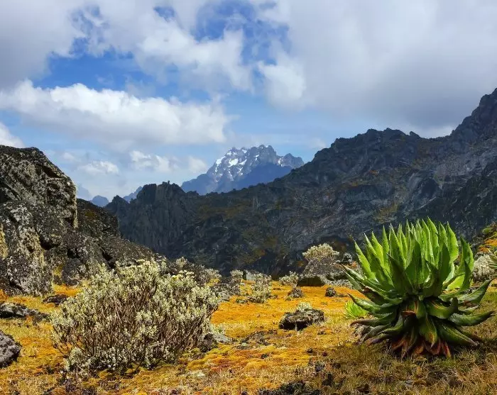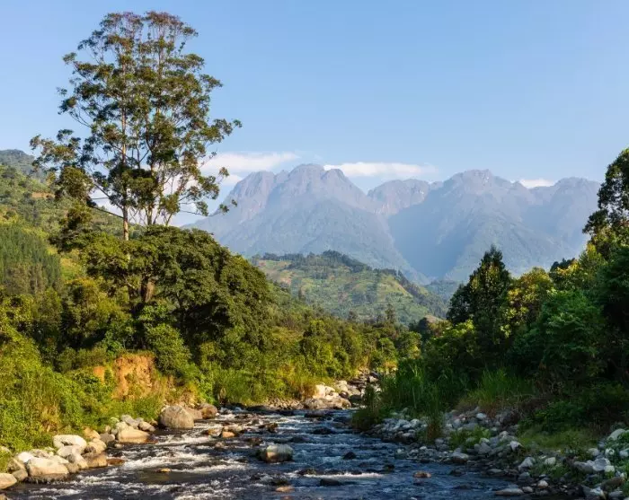 Från högåskammarna omkring Kibale har du en fenomenal utsikt över de mjuka, gröna kullarna med Rwenzoribergen i bakgrunden.