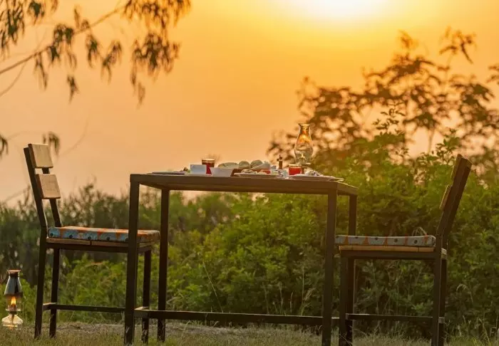Poolen är byggd på en träplattform i anslutning till gräsmattan och erbjuder både solstolar och utsikt. På kvällen tänds brasan, och med en lokal öl i handen kan dagens safariberättelser delas.