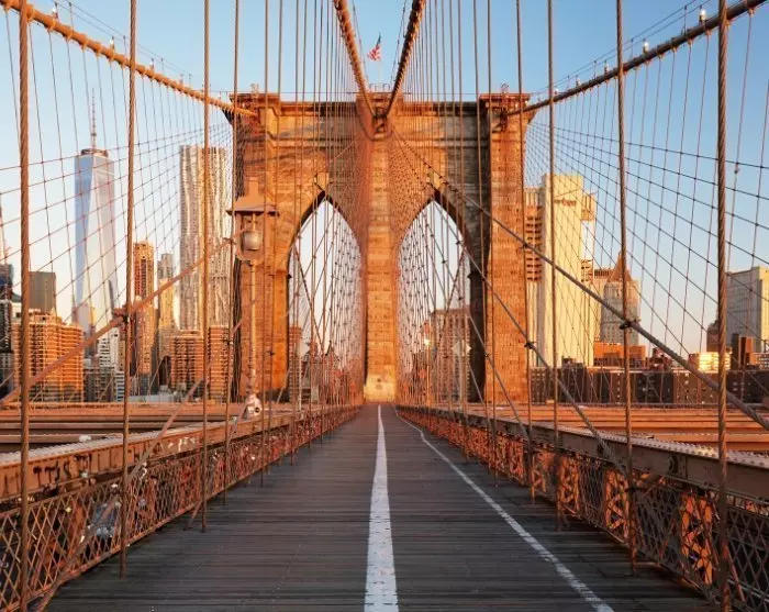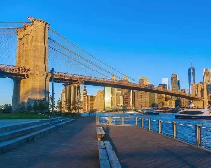 Från startpunkten kommer du och din grupp att åtföljas av er guide över Brooklyn Bridge, medan guiden berättar om brons fascinerande historia och med den fantastiska utsikten över Manhattan som bakgrund. På andra sidan bron kommer ni till DUMBO-området, där du kan uppleva kajområdet och se Brooklyn Bridge från en ny vinkel. DUMBO-området är känt för sin strandpromenad längs East River och dess charmiga stämning med massor av designers, konstnärer, specialbutiker och fantastiska matställen. Till slut når promenaden Brooklyn Bridge Park, varefter du kan fortsätta utforska området på egen hand.
