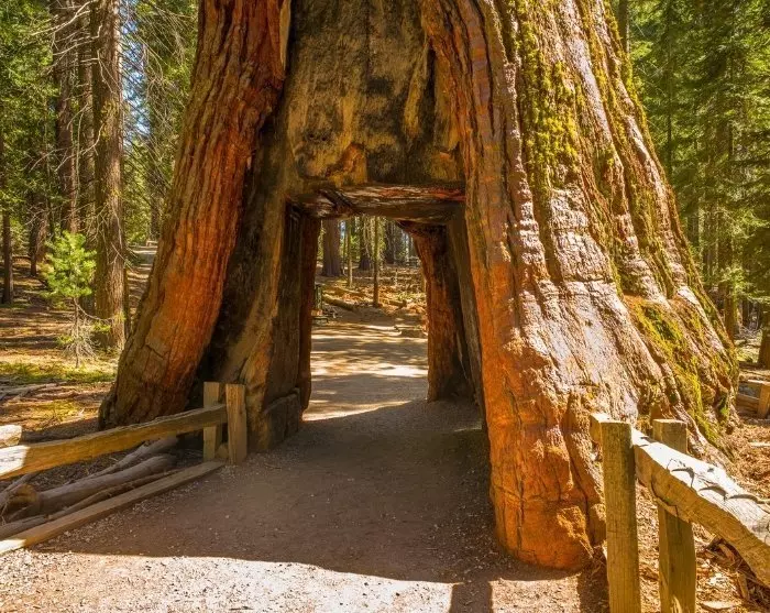 När du lämnar ditt hotell bör du ställa in GPS:en på att köra via Mariposa Grove. Här hittar du en lund med några av världens största träd – de gigantiska sequoiaträden – som enkelt nås via de anlagda stigarna (utom när det är snö på marken under vintersäsongen). Här känner du dig riktigt liten bland de stora stammarna, och inte minst vid California Tunnel Tree, som du kan gå igenom.