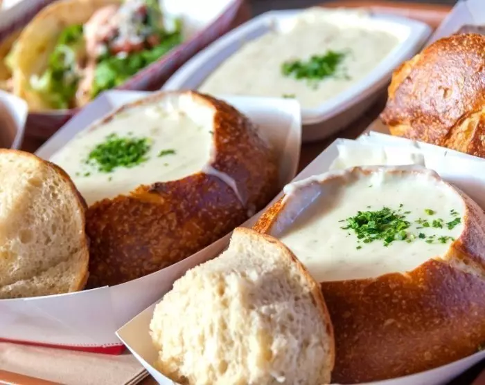 Avsluta dagen med att äta en läcker ”clam chowder” vid vattnet med utsikt över pelikaner som dyker efter sin middag här i Monterey Bay.