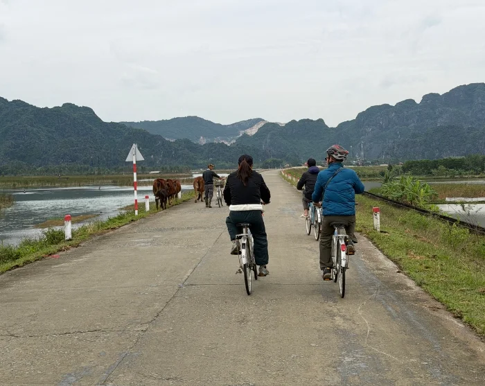 Du blir hämtad på ditt hotell av din guide och chaufför och färdas söderut från Hanoi mot provinsen Ninh Binh, som ofta kallas ”Ha Long-bukten på land”. Efter cirka 2,5 timmars körning når du distriktet Gia Vien, där dagens cykeltur på cirka 14 km börjar. Här hoppar du upp i sadeln och cyklar i lugnt tempo längs små vägar genom gröna risfält och förbi lokala byar på väg mot Van Longs naturreservat. Under vägen finns gott om tid att stanna till och ta bilder.