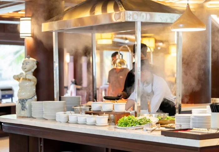 Resortens restaurang, Com Restaurant, är en naturlig mötesplats för frukost, lunch och middag. Här serveras vietnamesiska rätter med fokus på lokala råvaror samt ett urval av internationellt inspirerade rätter. Frukosten bjuder på både varma och kalla rätter samt kaffe, te och färskpressad juice.