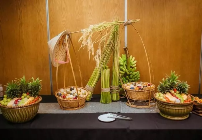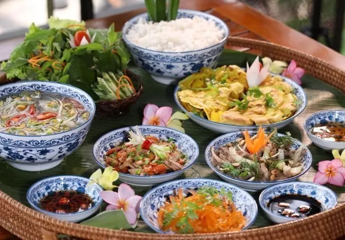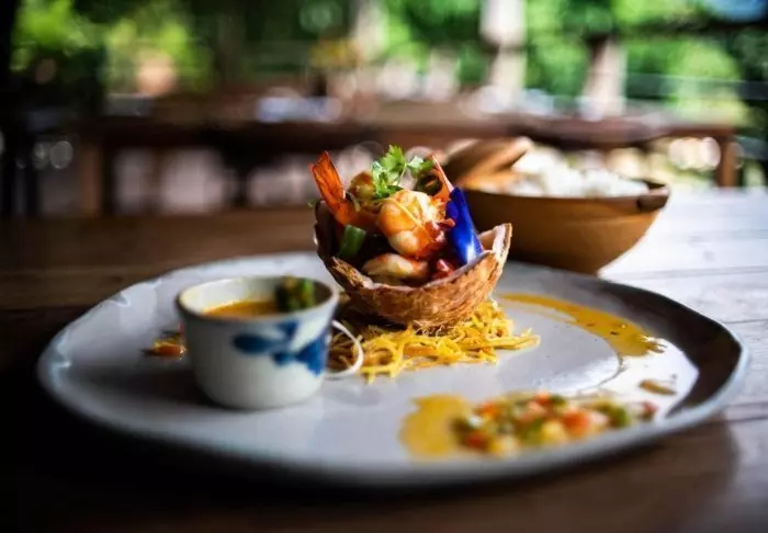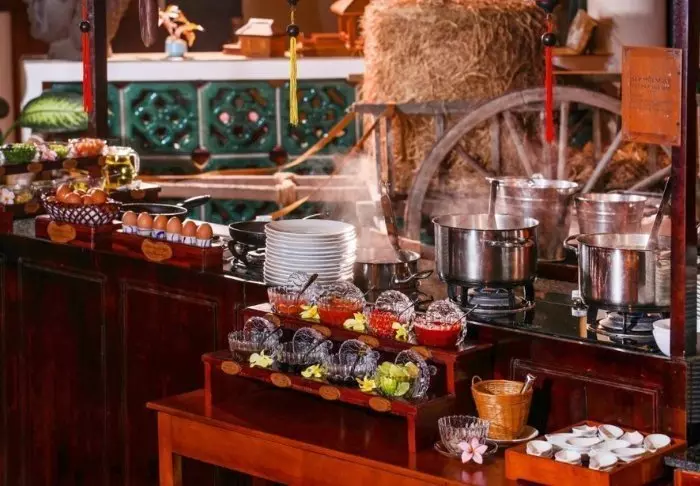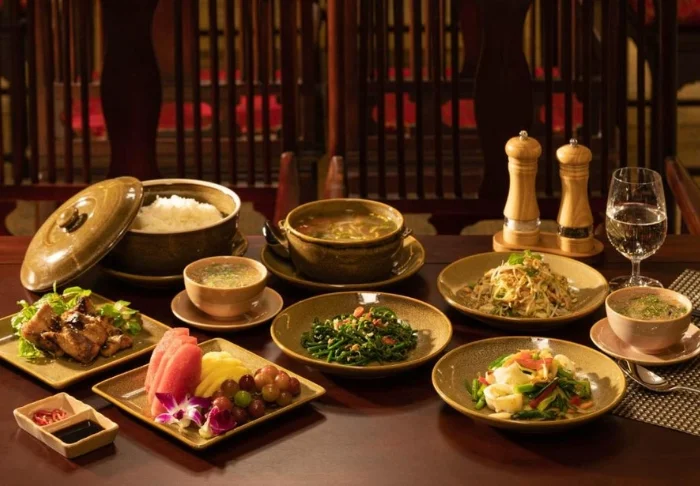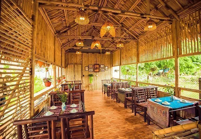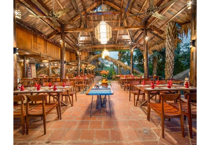 Restaurangens meny bygger på lokala råvaror från området och erbjuder traditionella vietnamesiska rätter med färska örter, fisk och frukt från deltat. Många av ingredienserna kommer direkt från hotellets egen trädgård, och maten kan avnjutas med utsikt över floden där solen sakta går ner bakom palmerna.