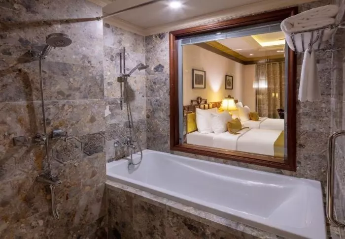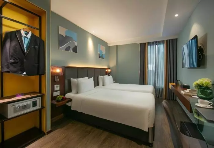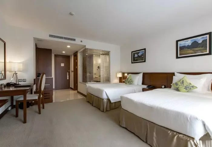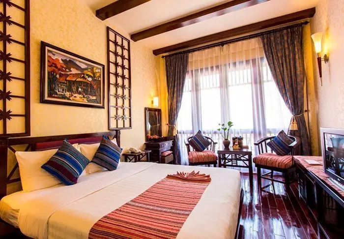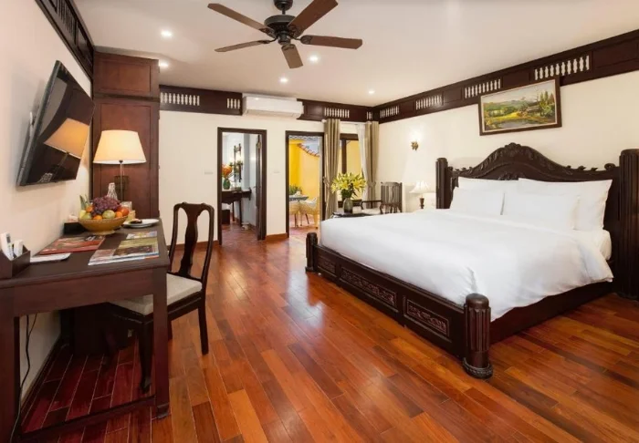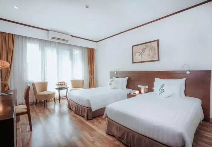 Som standard bor du i ett Superior-rum, där modern komfort möter en känsla av vietnamesisk elegans. Rummen har stora fönster med gott om dagsljus, detaljer i trä och klassiska möbler som skapar en varm och inbjudande atmosfär. Väggpanelerna är extra speciella med blommande körsbärsgrenar, som ger ett lokalt och konstnärligt uttryck. Alla rum är utrustade med en dubbelsäng eller två enkelsängar, kylskåp, TV, värdeskåp, vattenkokare, aircondition och ett eget badrum med toalettartiklar och hårtork. De genomtänkta detaljerna skapar en lugn bas där du enkelt kan koppla av efter dagens upplevelser.