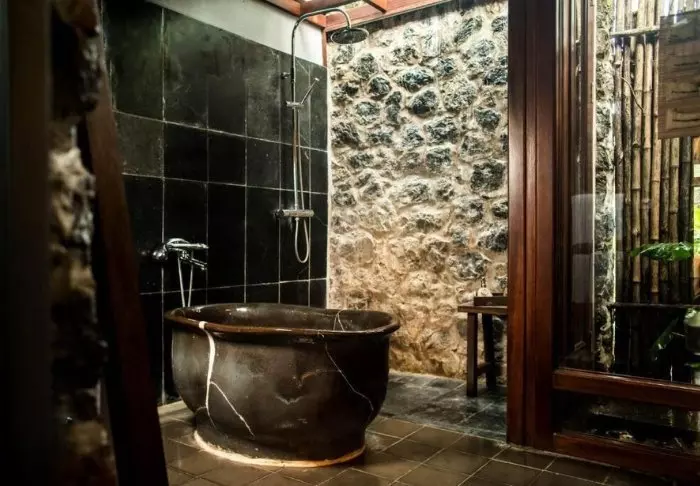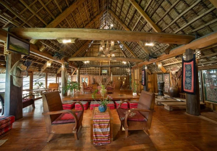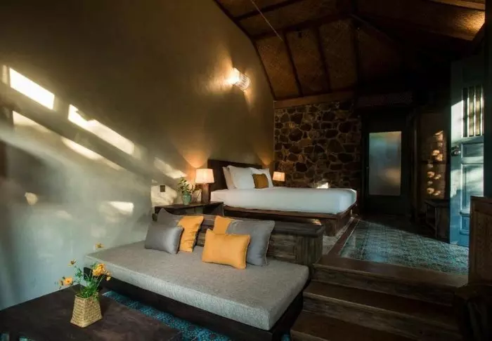 Den miljövänliga resorten är byggd i naturliga och hållbara material, och det mesta av resortens inventarier är framställda i fint mörkt trä på resortens eget snickeri.