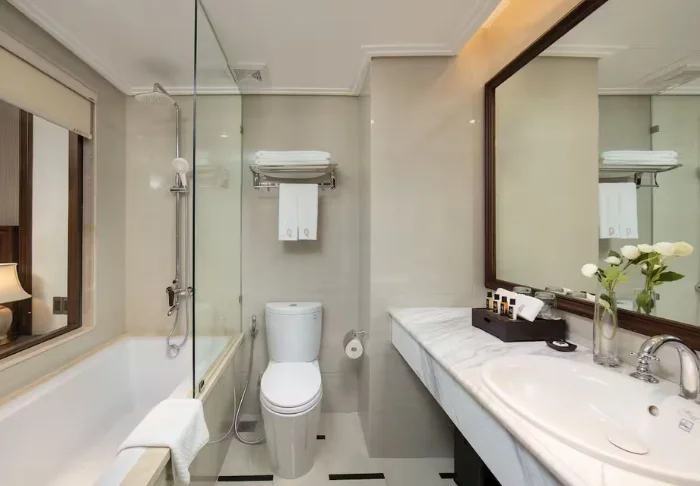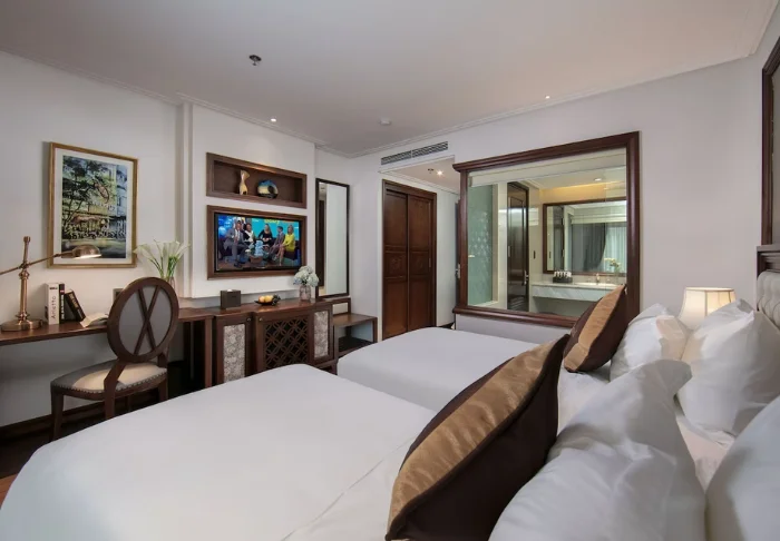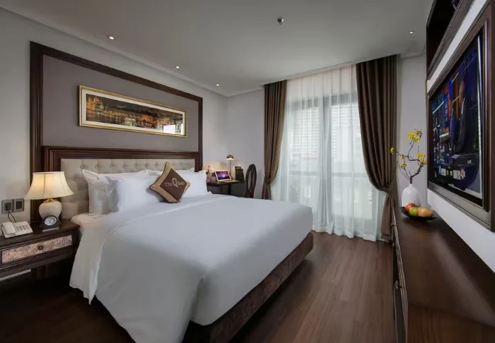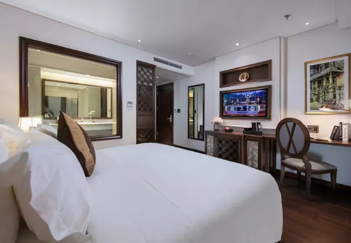 Du bor i ett Superior-rum inrett i klassisk vietnamesisk stil med mörka trämöbler och varma toner. Inredningen är enkel och funktionell, och rummet är utrustat med aircondition, wifi, minibar, kaffe- och tekokare, värdeskåp och platt-TV. Badrummet har dusch, badrock, hårtork och toalettartiklar.