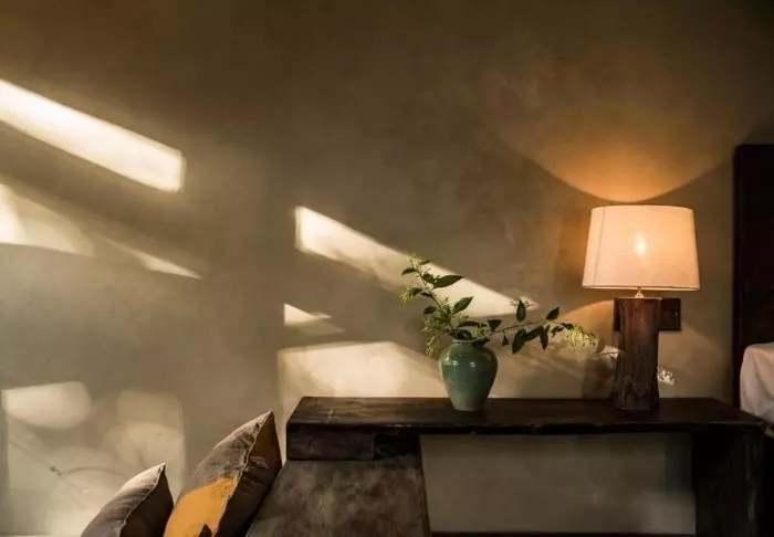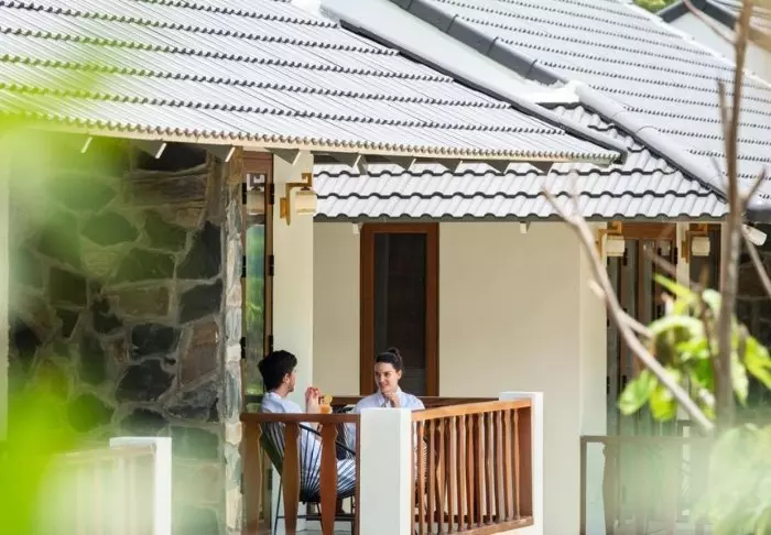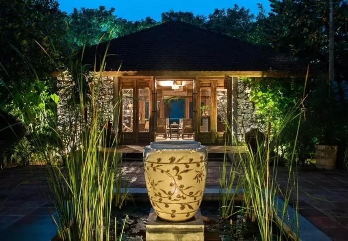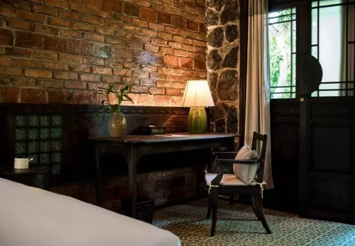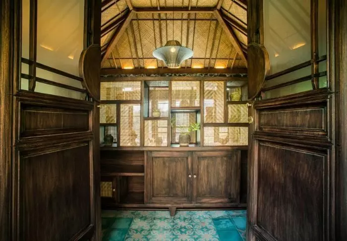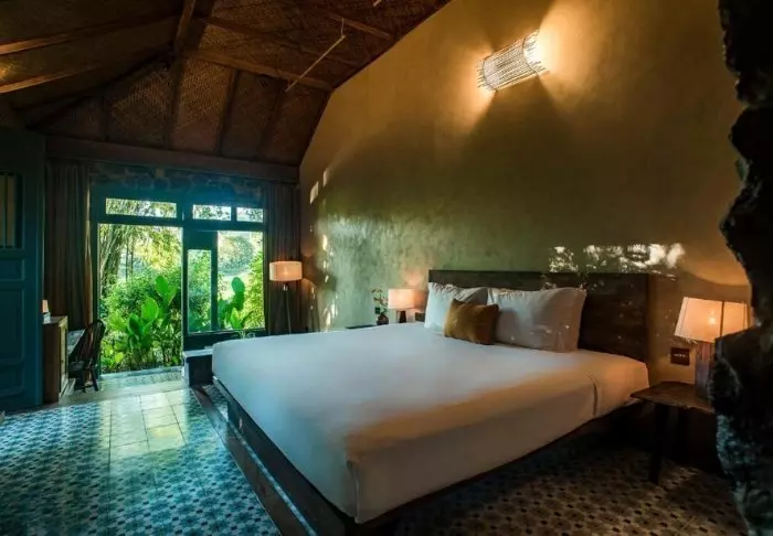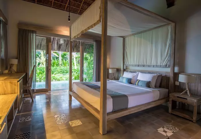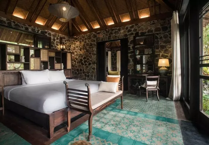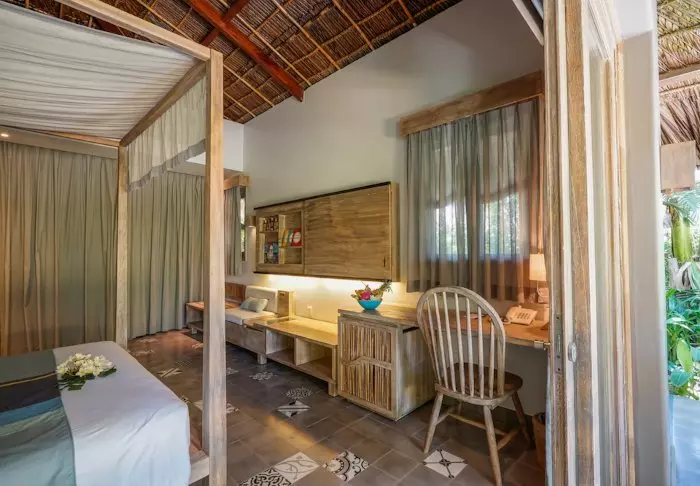 Var och en av resortens 19 bungalower är uppdelade i två stora rum, och varje rum har eget badrum och terrass med utsikt över trädgården. Rummens stilfulla inredning består av lokala träslag, sten, keramik och stenplattor med traditionella mönster, vilket ger dem en sofistikerad charm.