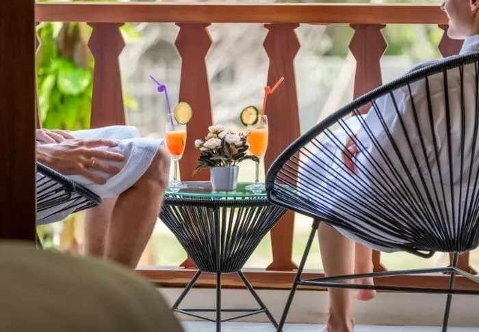 Efter en dag full av upplevelser kan du ta ett dopp i poolen med utsikt över risfälten, eller söka dig till skuggan under palmerna med en bra bok.