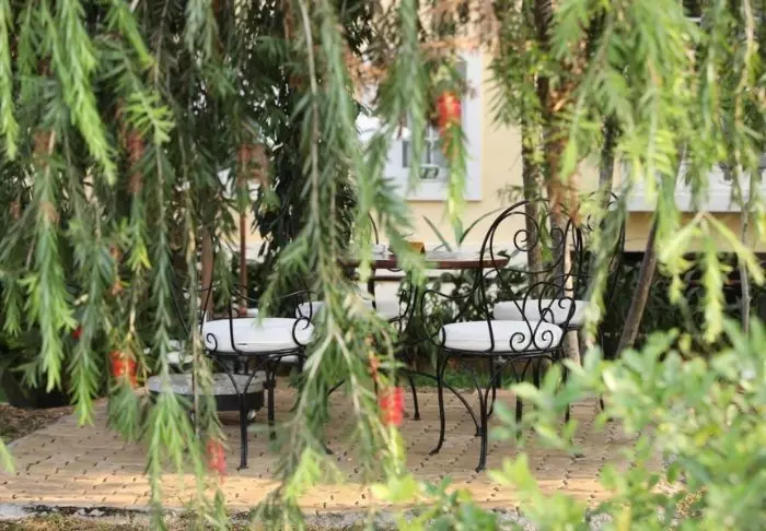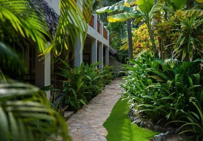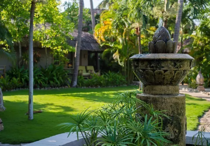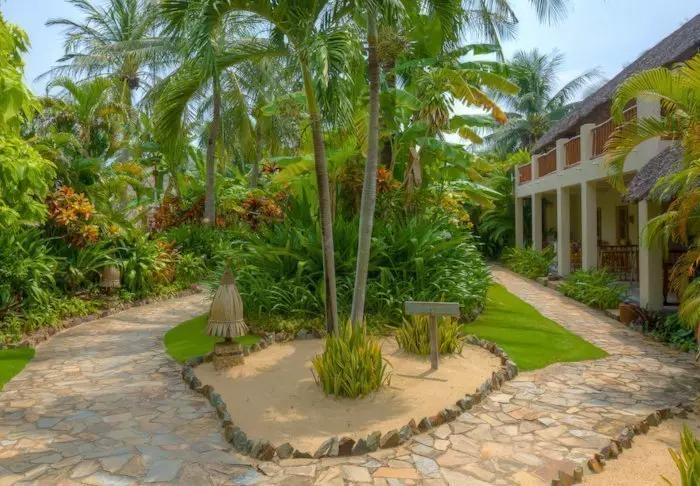 Resortens 30 rum ligger utspridda som bungalower i den frodiga trädgården. Här finns porlande vatten, färgrika blommor och små skuggiga hörn, som du kan dåsa i.
