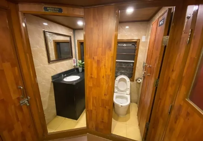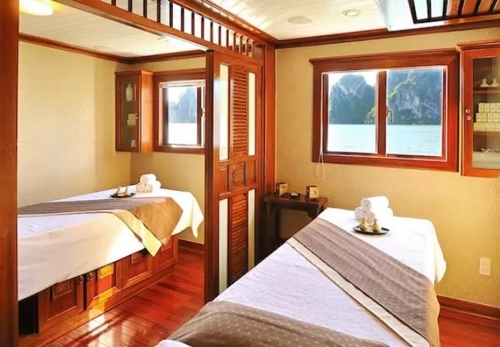 Fartyget har 18 hytter, och som standard bor du i kategorin ”deluxe”, där stora fönster vetter rakt ut mot vattnet. Här kan du vakna till mjuka vågskvalp och morgonljus över bukten. Hytterna är inredda med varma träslag, mjuka gardiner, mörka trämöbler och klassiska detaljer i vietnamesisk stil. Du sover i en dubbelsäng eller två enkelsängar, och möjlighet till en extrasäng för ett barn under 12 år finns. Det finns även aircondition, minibar, vattenkokare för te och kaffe samt ett eget badrum med dusch och toalettartiklar. Rummen känns enkla och intima, men har allt du behöver – och utsikten är svår att överträffa.