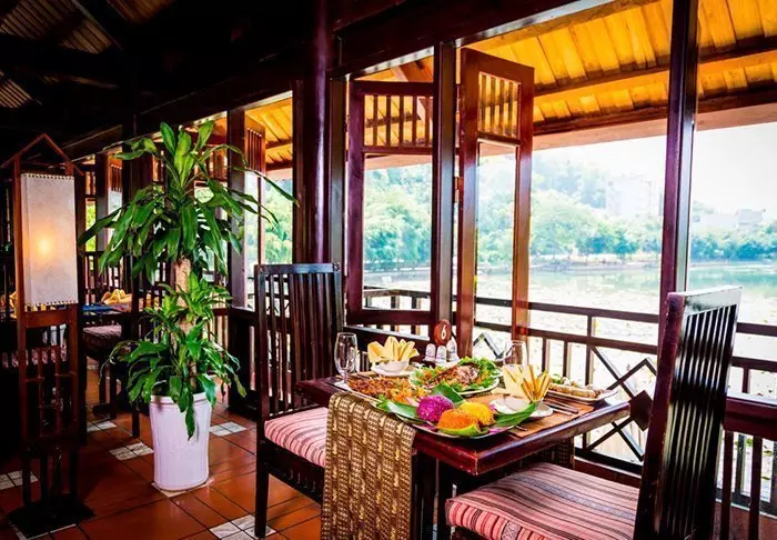 Restaurangen ombord bjuder på vietnamesiska rätter lagade av lokala råvaror och kryddade med exotiska smaker. Den mysiga träinredningen skapar en romantisk stämning.