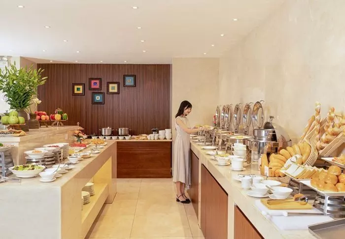 Frukosten serveras som buffé och bjuder på en härlig blandning av vietnamesiska specialiteter och internationella rätter. Du kan välja att äta middag på hotellets restaurang eller utforska området, där både lokalbor och resenärer samlas över rykande skålar pho och en kall Saigon-öl.