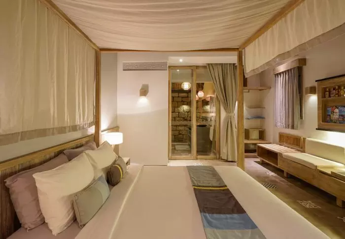 Rummen är smakfullt inredda i en elegant kombination av naturliga färger kryddad med enstaka kontrastfärger på bland annat kuddar och mattor. Badrummen är delvis öppna i taket så att du känner brisen och doften av havet. Alla rum har aircondition, minibar, te- och kaffefaciliteter, värdeskåp, wifi, platt-tv, myggnät och egen veranda.