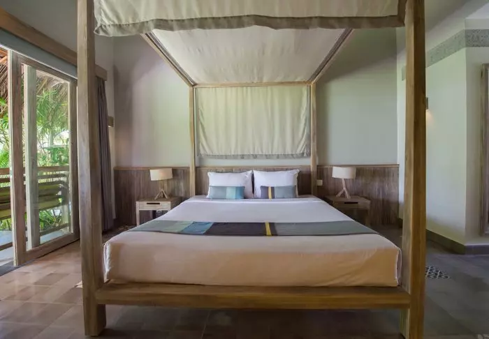 Du bor som standard i en Garden View Bungalow, där rummet är enkelt inrett med allt du behöver under din vistelse. Här finns antingen en dubbelsäng eller två enkelsängar med myggnät, och rummet är utrustat med aircondition, minibar, wifi, värdeskåp samt badrum med dusch och toalettartiklar. Från din privata terrass har du utsikt över de gröna omgivningarna, så naturen känns alltid nära.