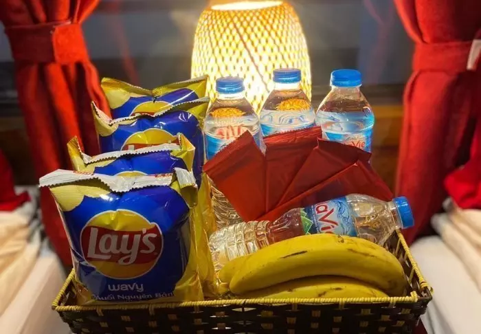 I sovkupén finns ett litet välkomstpaket med lite frukt, tilltugg och vatten. Vi rekommenderar dock att du köper extra mat och dryck till resan innan du går ombord.