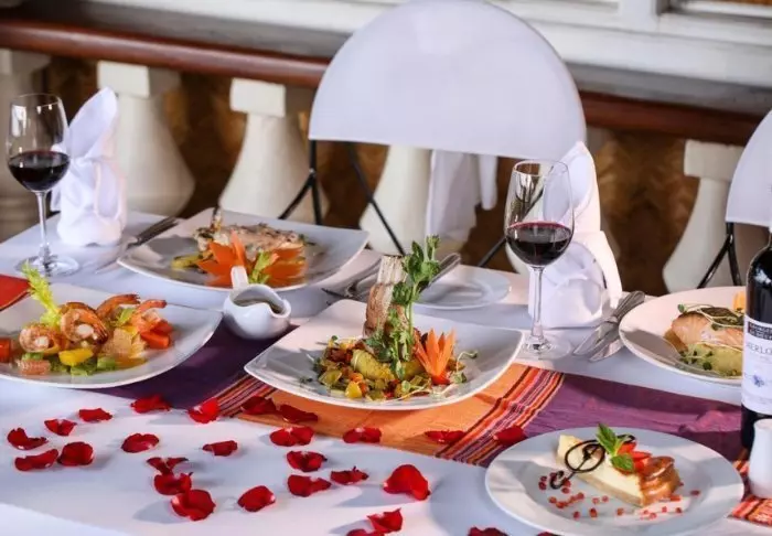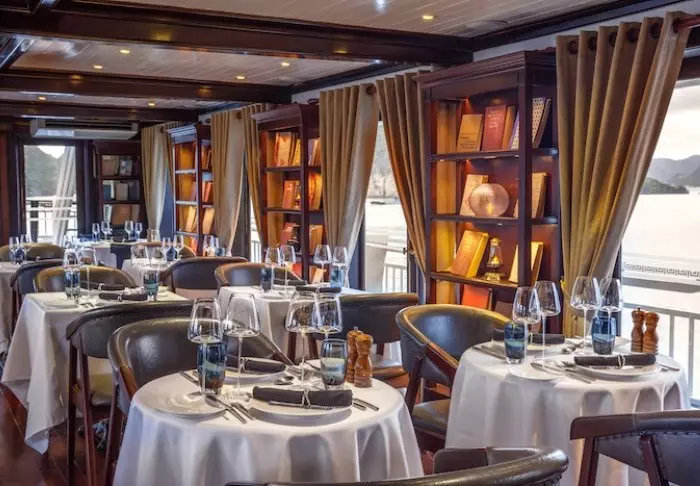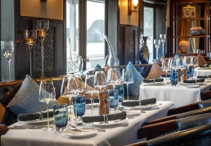 Restaurangen serverar rätter från både det vietnamesiska och internationella köket, tillagade med råvaror av hög kvalitet. Atmosfären är elegant och middagen på däck, med solnedgången som bakgrund, blir en av resans höjdpunkter.