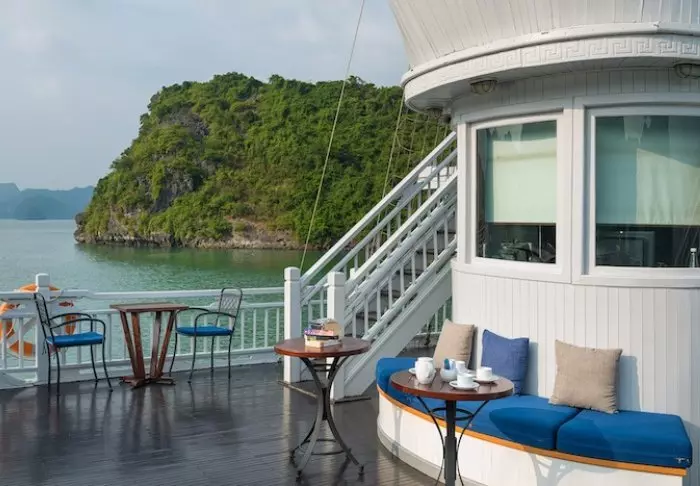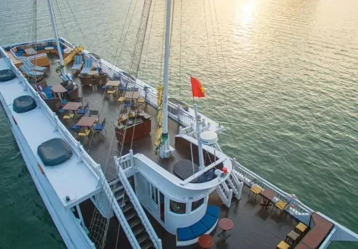 Ombord kan du njuta av både ett soldäck och en restaurang, där det serveras nyfångad fisk och vietnamesiska klassiker, medan fartyget sakta passerar det spektakulära landskapet. Under dagen lägger båten till vid öde öar och små fiskebyar. Du kan följa med på utflykter med kajak, besöka grottor eller hoppa direkt i vattnet från båtens akter. På kvällen råder lugn, stillhet och stjärnhimmel – kanske med en kall drink på däck.