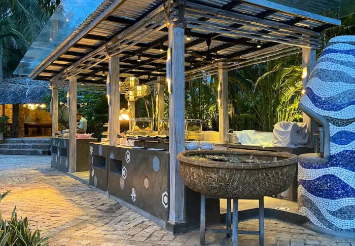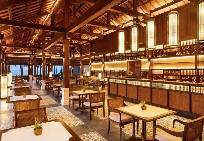 Från restaurangen och baren ser du ut över poolen och stranden. Restaurangen bjuder på både vietnamesiska och västerländska rätter, allt med en både lokal och hållbar prägel. Här finns något för alla – även vegetarianer och veganer.
