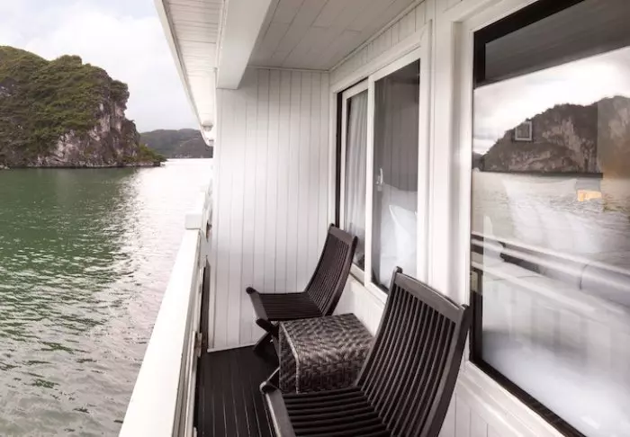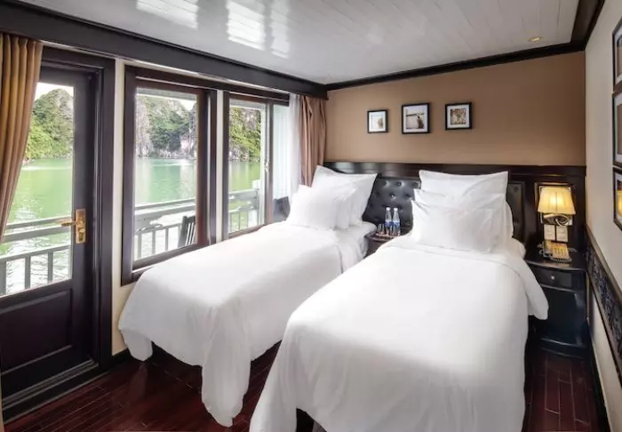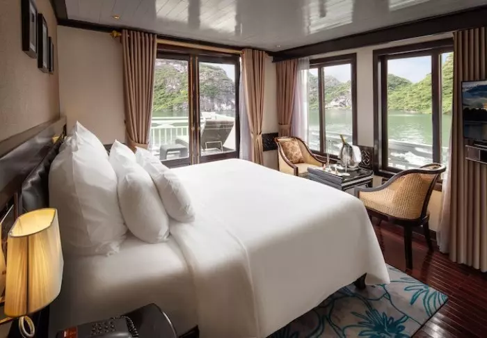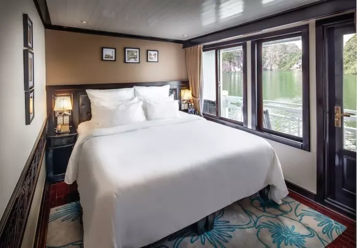 Fartyget har 24 hytter fördelade på två däck, och inredningen är inspirerad av vietnamesiskt hantverk och kultur. Hytterna har mörka träpaneler, konstfulla detaljer och stora panoramafönster ut mot bukten. Alla är utrustade med aircondition, minibar, värdeskåp, te- och kaffefaciliteter samt badrum med både badkar och separat dusch. Hytterna är rymliga och kombinerar varma material med moderna bekvämligheter. Med andra ord: en välkomnande bas mellan dagens alla upplevelser.