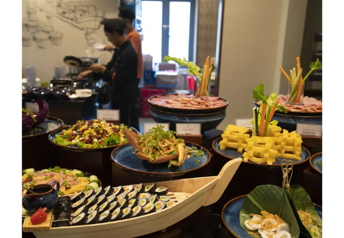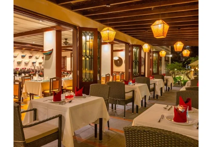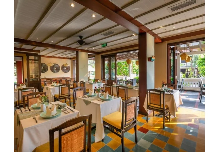 Hotellets restaurang har både inomhus- och utomhusplatser där du kan njuta av internationella och vietnamesiska favoriter i en lugn miljö.
