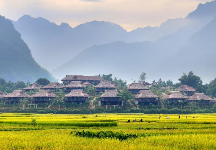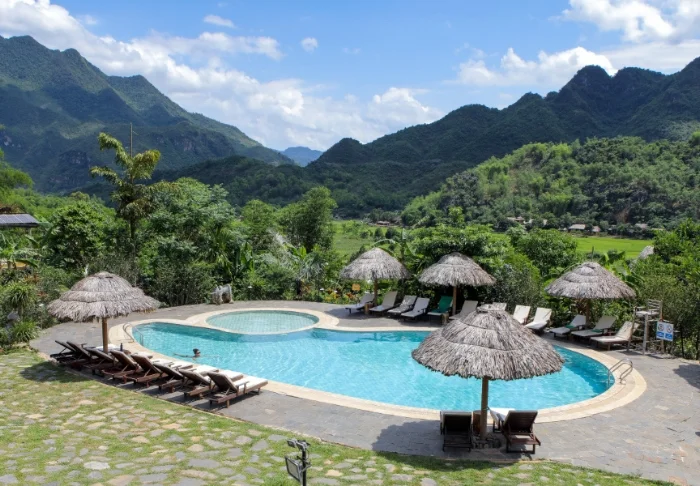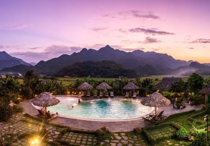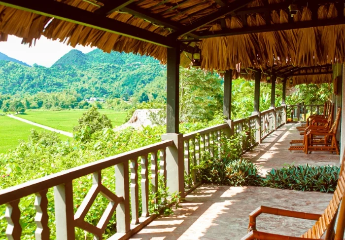 Mai Chau Ecolodge ligger på en grön bergssluttning mitt i Mai Chau-dalen, omgiven av risfält och med bergen som en rofylld fond. Lodgen är byggd i traditionell stil, inspirerad av det lokala Thai-folkets pålbyggda hus, och smälter naturligt in i landskapet. Här bor du lite avskilt från byn med lugn och ro runt dig, samtidigt som du har enkel tillgång till det lokala livet i området.