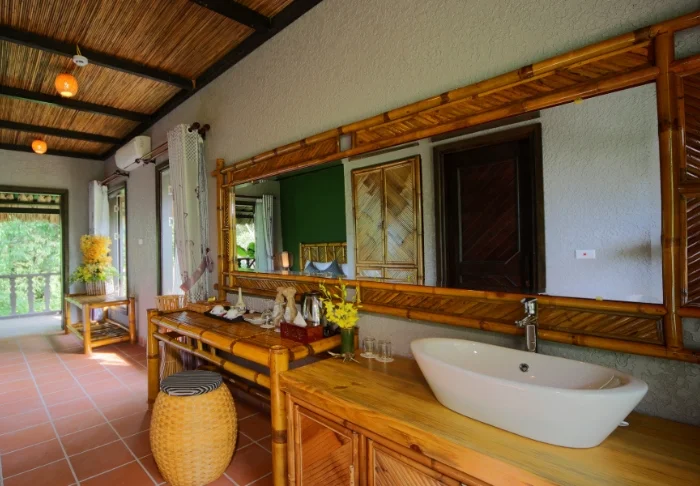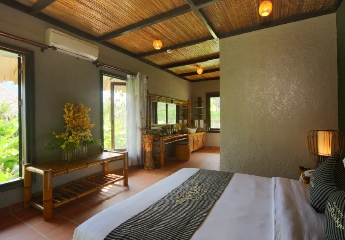 Lodgen har 43 rum, och som standard bor du i ett superiorrum som är rymligt och inrett med varma naturmaterial som bambu, trä och handgjorda detaljer. Sängen står centralt i rummet och omges av mjuka textilier och dämpade färger som skapar en lugn atmosfär. Rummet har aircondition, minibar, kaffe- och tefaciliteter samt värdeskåp. Badrummet har ett fristående handfat, gott om bänkyta och en duschhörna. Från den täckta terrassen har du utsikt över gröna kullar och frodig grönska. Terrassen är öppen med begränsad avskärmning och möblerad med stolar där du kan slå dig ner och njuta av lugnet och den friska luften.