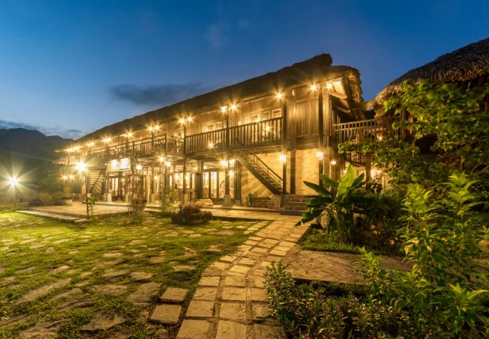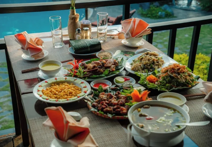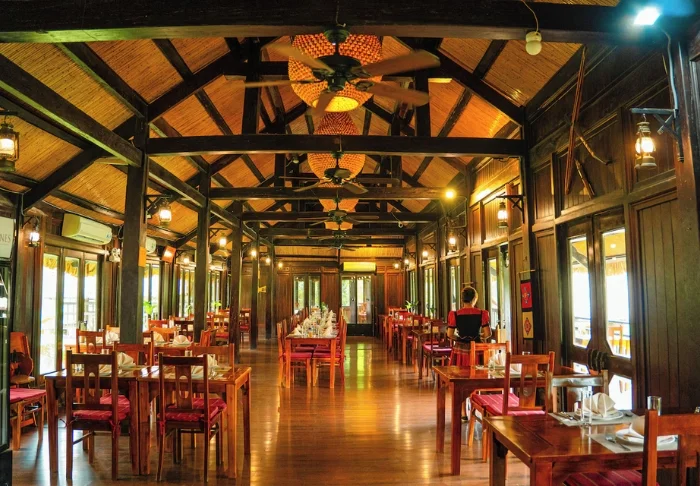Restaurangen serverar vietnamesiska rätter baserade på lokala råvaror, och på kvällen samlas många gäster här, inte bara för att njuta av maten utan också av utsikten när solen går ner över dalen. Vissa kvällar bjuder lodgen på traditionella uppträdanden med musik och dans som ger en stämningsfull inblick i thaifolkets kultur.