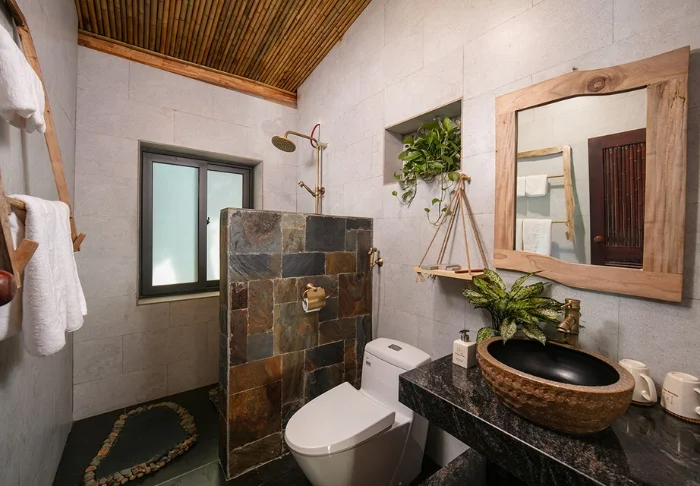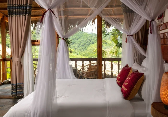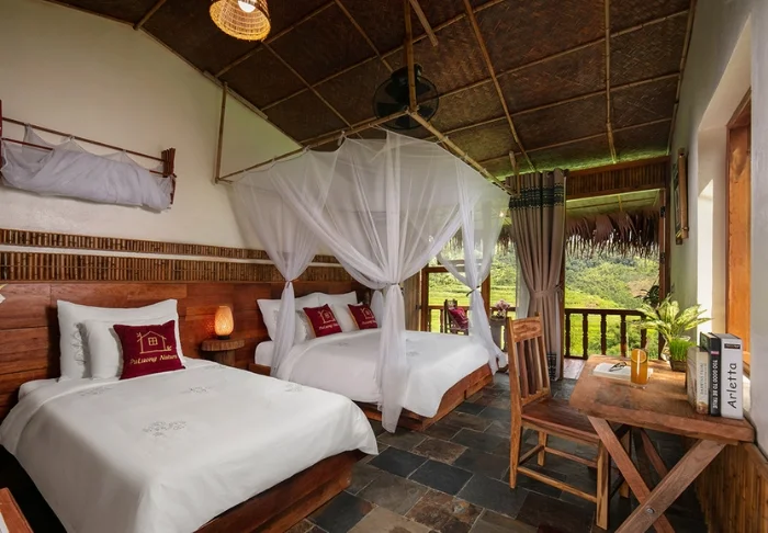 Du bor som standard i ett Deluxe Valley View-rum på 32 m² med utsikt över några av områdets vackraste risfältsterrasser. Rummet är byggt i trä och bambu, och både väggar och tak är klädda i naturliga material som speglar Pu Luongs traditionella byggnadsstil. Gardinerna är dekorerade med broderade detaljer sydda av lokala thaikvinnor, vilket ger rummet en personlig känsla. Här finns en kingsize-säng samt en extrasäng med plats för två vuxna och ett barn. Från balkongen kan du njuta av morgonsolen med en kopp vietnamesiskt kaffe medan dalen långsamt vaknar. Rummet har dessutom aircondition, minibar, vattenkokare samt badrum med dusch och varmvatten.