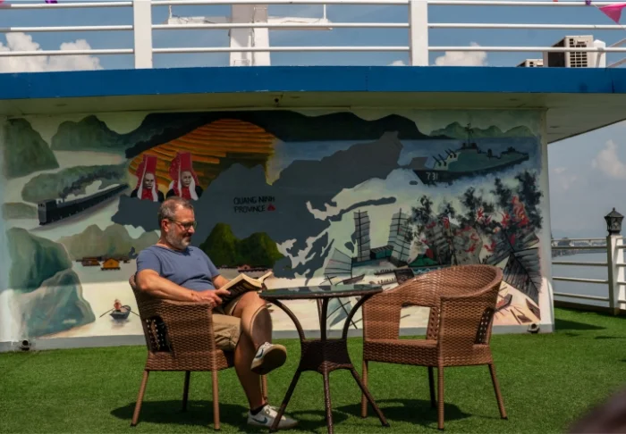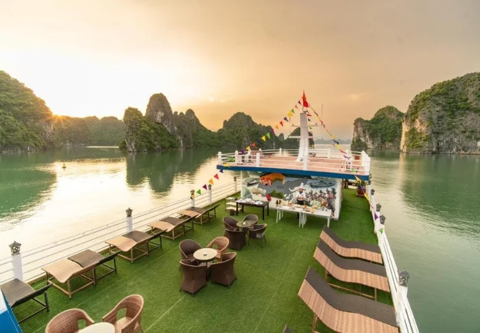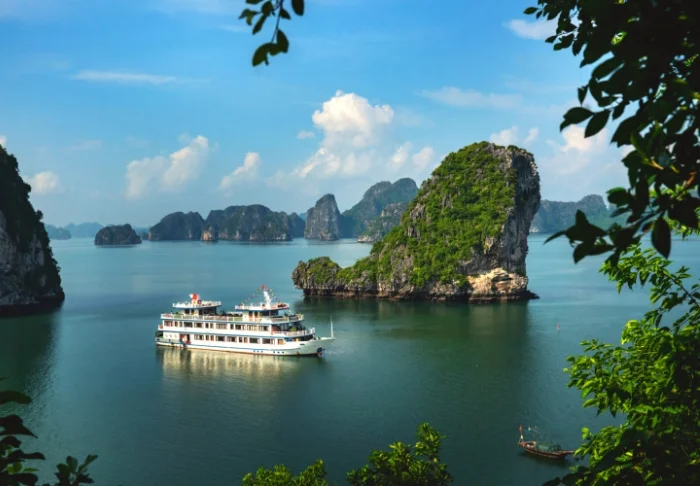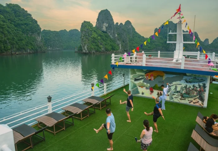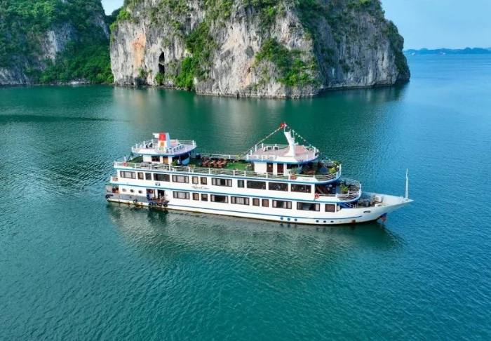 Ombord kan du njuta av både ett soldäck och en restaurang, där det serveras nyfångad fisk och vietnamesiska klassiker, medan fartyget sakta passerar det spektakulära landskapet. Under dagen lägger båten till vid öde öar och små fiskebyar. Du kan följa med på utflykter med kajak, besöka grottor eller hoppa direkt i vattnet från båtens akter. På kvällen råder lugn, stillhet och stjärnhimmel – kanske med en kall drink på däck.
