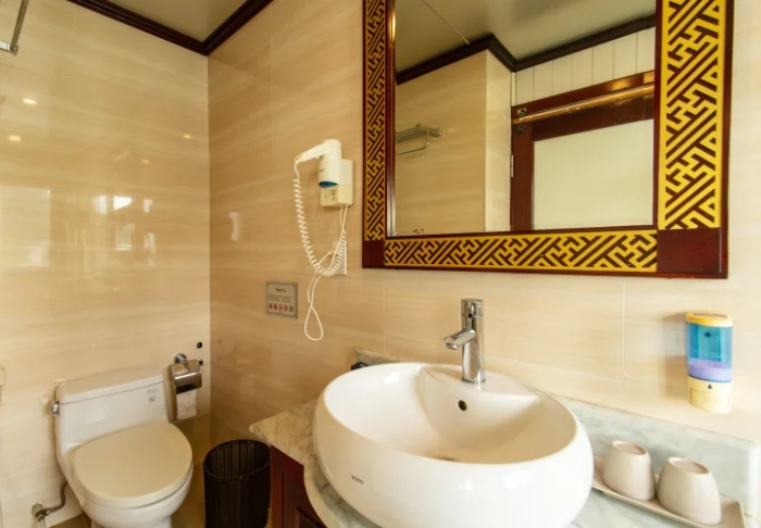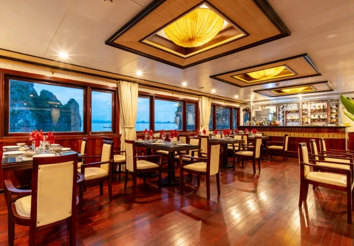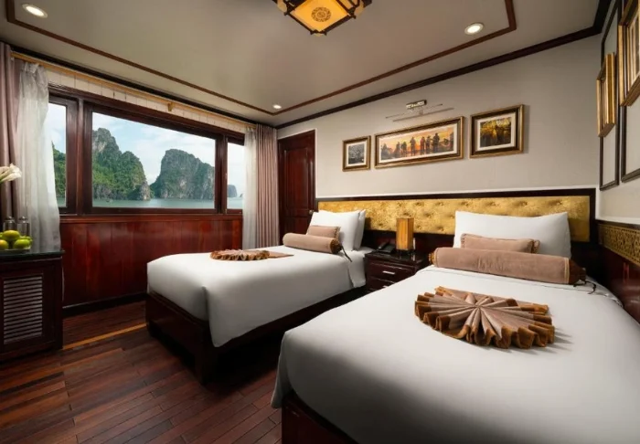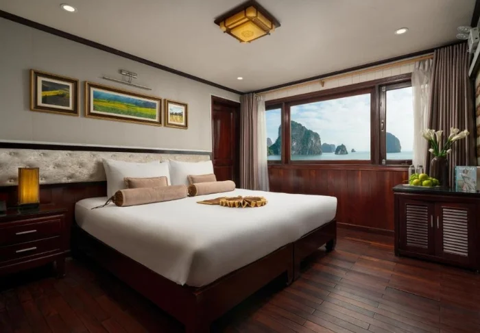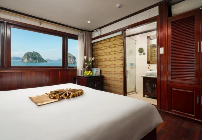 Fartyget har 18 hytter, och som standard bor du i kategorin ”deluxe”, där stora fönster vetter rakt ut mot vattnet. Här kan du vakna till mjuka vågskvalp och morgonljus över bukten. Hytterna är inredda med varma träslag, mjuka gardiner, mörka trämöbler och klassiska detaljer i vietnamesisk stil. Du sover i en dubbelsäng eller två enkelsängar, och möjlighet till en extrasäng för ett barn under 12 år finns. Det finns även aircondition, minibar, vattenkokare för te och kaffe samt ett eget badrum med dusch och toalettartiklar. Rummen känns enkla och intima, men har allt du behöver – och utsikten är svår att överträffa.