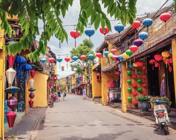 Bort från floden breder en labyrint av små, charmiga gränder ut sig. Här möts du av en färgstark blandning av japanska trähus, kinesiska samlingshus, franska kolonialbyggnader och de karaktäristiska köpmanshusen. Färgglada lyktor hänger som girlander över gatorna och skapar en trevlig stämning, särskilt när mörkret faller. Butiker, gatukök, caféer och små restauranger ligger sida vid sida och bjuder in till avkopplande pauser och nyfikna upptäckter.