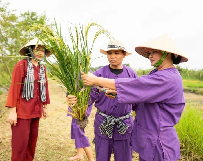 Du fortsätter sedan till vårt hållbarhetsprojekt i Vinh Long, som initierats av vår lokala samarbetspartner. Här väntar en lugn promenad genom byn, där din guide ger dig inblick i projektet längs vägen. Du får även chansen att prova på det traditionella lantbrukslivet. Tillsammans med lokala bönder får du prova på risodling – antingen genom att plantera späda risplantor eller genom att hjälpa till vid skörden, beroende på säsong. Det är en lärorik och jordnära upplevelse som ger dig en unik inblick i livet på den vietnamesiska landsbygden och det arbete som ligger bakom ett hållbart jordbruk. Genom att delta på denna tur bidrar du samtidigt till att göra skillnad för familjerna i Vinh Long, då en andel av priset på resan går direkt till projektet, som du kan läsa mer om här.