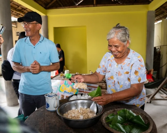 Tuk-tuk-turen tar dig med genom byns stillsamma vägar. Första stoppet är hos en lokal familj där du får smaka på com dep (gröna riskorn) och se hur popris tillverkas.