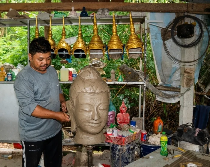Resan fortsätter med ett besök hos en skicklig khmerkonstnär som skapar statyer och masker till områdets pagoder.