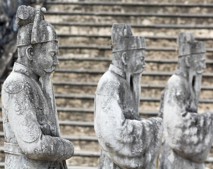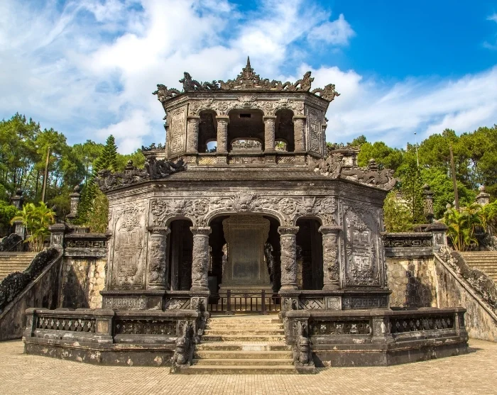 Därefter går resan vidare till kejsar Khai Dinhs grav, som skiljer sig markant från andra kejsargravar i området. Gravkomplexet byggdes i början av 1900-talet och förenar traditionella vietnamesiska element med europeisk barock och gotik. Resultatet är en storslagen och detaljrik arkitektonisk upplevelse, en hyllning till den bortgångne kejsaren och ett uttryck för hans fascination för västerländsk konst och kultur.