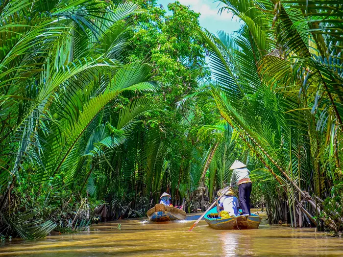 Efter ungefär 2,5 timmes bilresa når du staden Cai Be. Här stiger du ombord på en båt och ger dig ut på det frodiga Mekongdeltat. Du besöker lokala verkstäder där skickliga hantverkare tillverkar produkter av kokosnöt. Därefter fortsätter du i en liten sampan – en traditionell handrodd träbåt – genom Mekongdeltats smala och slingrande kanaler.