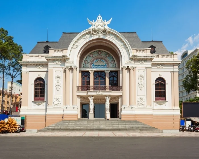 Du passerar Saigonoperan, ett arkitektoniskt mästerverk från 1901 och en levande symbol för stadens kulturella arv. Byggnaden har haft en anmärkningsvärd historia – från att ha fungerat som skyddsrum till att senare hysa underhuset i Sydvietnams parlament.
