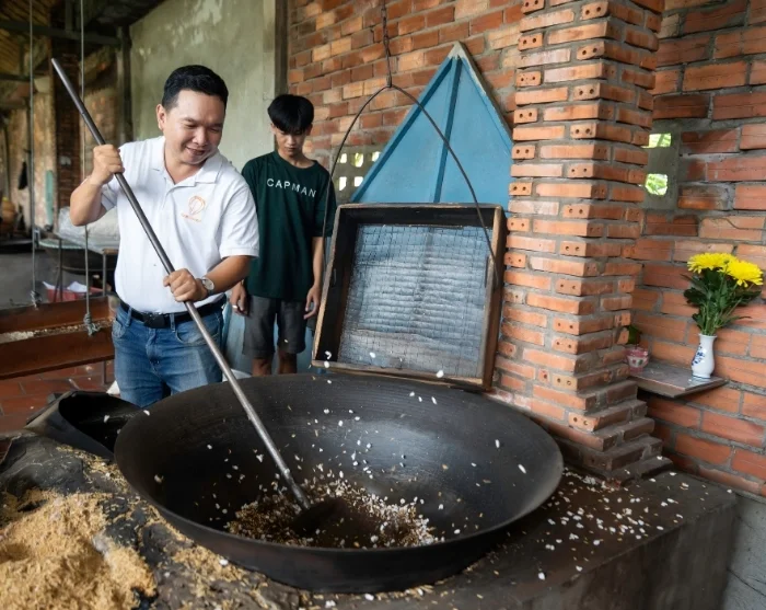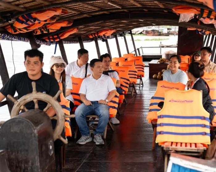 Efter cirka 2,5 timmes bilresa anländer du till staden Cai Be. Här går du ombord på en båt och seglar ut i det gröna Mekongdeltat. Du besöker lokala verkstäder där skickliga hantverkare tillverkar produkter av kokos. Därefter fortsätter du i en liten sampan – en traditionell, handrodd träbåt – genom Mekongdeltats smala och slingrande kanaler.