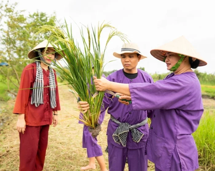 Resan fortsätter sedan till vårt sociala hållbarhetsprojekt i Vinh Long, som har startats av vår lokala samarbetspartner. Här väntar en lugn promenad genom byn medan din guide berättar mer om projektet. Du får också möjlighet att delta i det traditionella jordbrukslivet. Tillsammans med lokala bönder får du prova på risodling, antingen genom att plantera späda risplantor eller hjälpa till vid skörden, beroende på säsong. Det är en lärorik och jordnära upplevelse som ger dig en unik inblick i vardagen på Vietnams landsbygd och i arbetet bakom ett hållbart jordbruk. Genom att delta i turen bidrar du dessutom till att göra skillnad för familjerna i Vinh Long, eftersom en procentandel av resans pris går direkt till projektet, som du kan läsa mer om här.