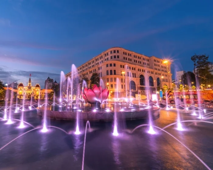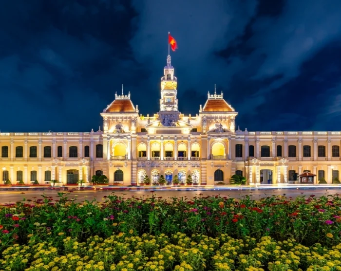 Vid skymning kan du promenera längs Nguyen Hue-promenaden, som kantas av blommor, fontäner och vacker arkitektur. Här kan du uppleva det livliga stadslivet när lokalbefolkningen samlas tillsammans med gatuartister, dansare och unga familjer i ett charmigt myller. Stämningen är både avslappnad och livlig, och allt kulminerar kring stadens upplysta rådhus.