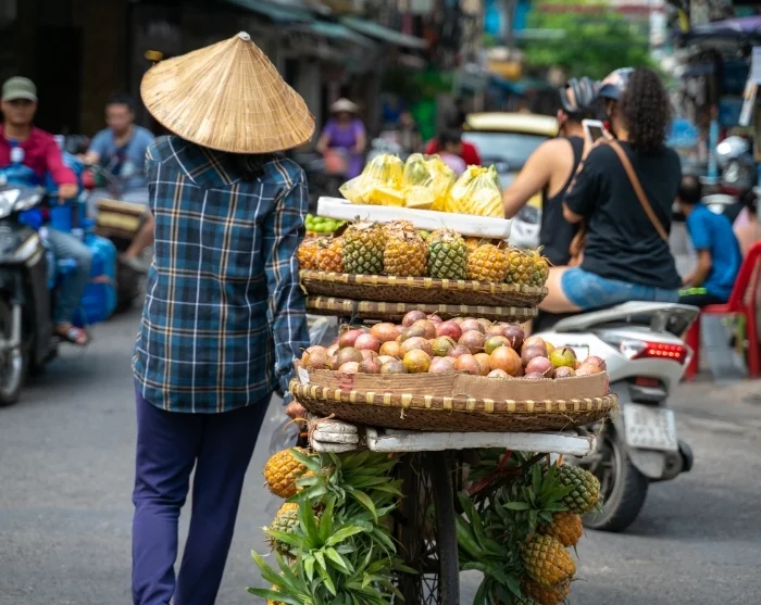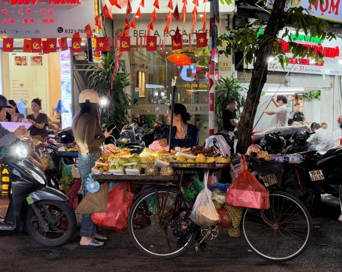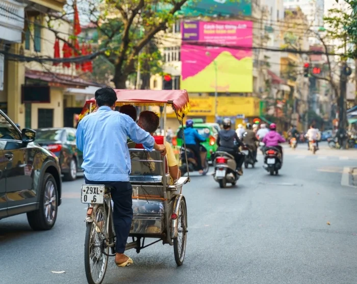 Turen fortsätter i en traditionell cykeltaxi – även kallad cyclo – genom det gamla kvarterets labyrint av smala gränder och livligt gatuliv. Det gamla kvarteret är känt för sina 36 gator, som ursprungligen fick sina namn efter varorna som såldes där: bambu, siden, papper och plåt. Än idag lever många av gatunamnen kvar, och här råder en genuint lokal stämning där hanoibor fortfarande handlar, småpratar och serverar rykande pho från gatuköken.