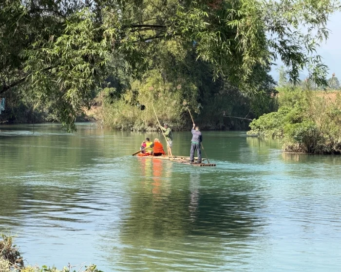 Du kommer fram till en stilla flod där en fridfull båttur på en traditionell bambuflotte väntar. Du får en flytväst, och när flotten rör sig mot strömmen kan du hjälpa till att paddla om du vill.