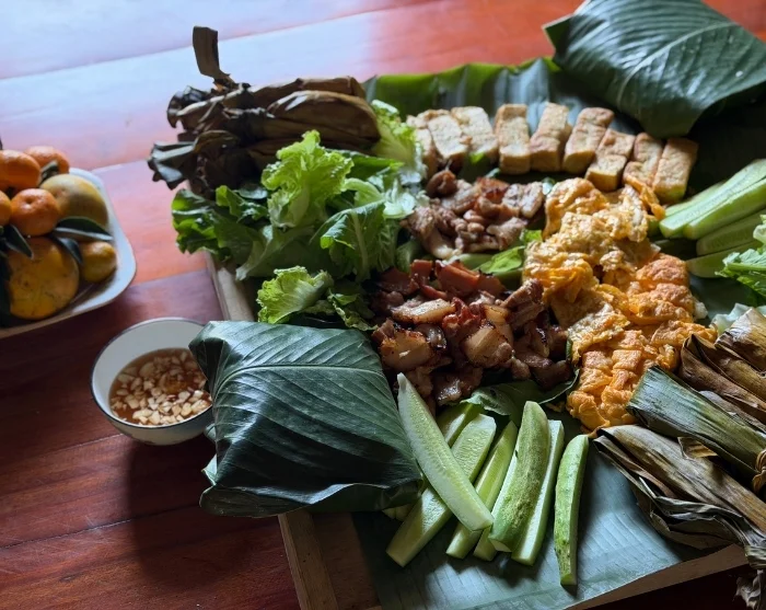Efter båtturen besöker du ett lokalt byhus där du tillsammans med värdarna hjälper till att laga traditionella rätter. Lunchen serveras vid ett fint dukat bord med lokala specialiteter som ni avnjuter tillsammans – en genuin inblick i områdets matkultur. Det finns också tid att prata med värdarna och lära dig mer om Muong-folkets vardag, kultur och traditioner.