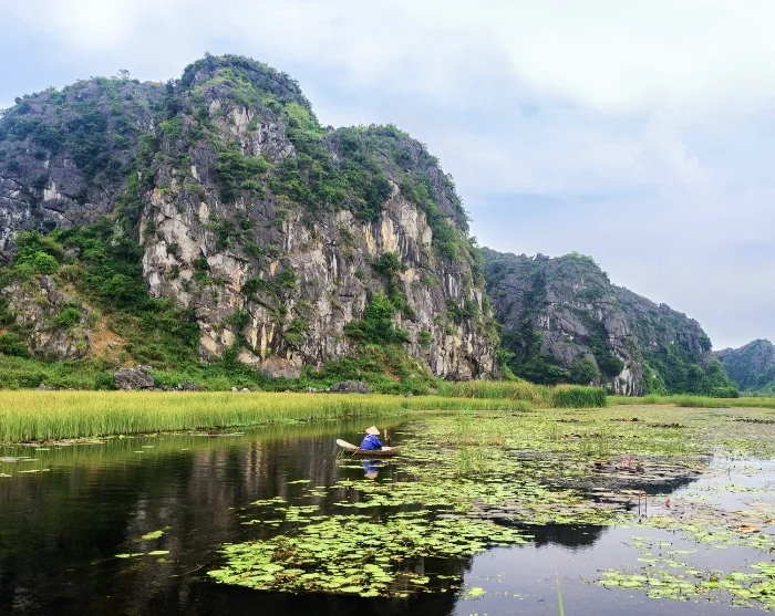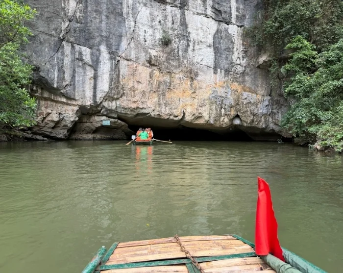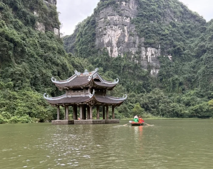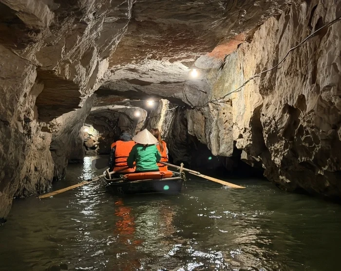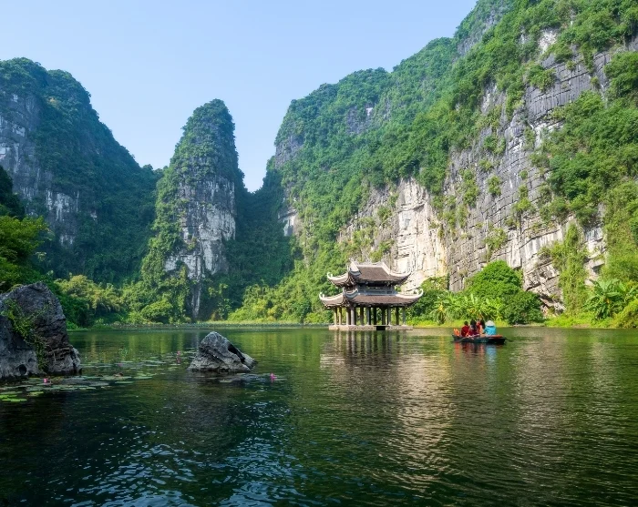 Efter lunchen cyklar du tillbaka till startpunkten – en tur som tar bara några minuter. Här lämnar du cykeln och blir sedan körd till Trang An-grottorna, ett spektakulärt naturområde med dramatiska klippformationer och dolda grottor. Du går ombord på en traditionell sampan som rofyllt glider fram på den stilla floden genom ett nätverk av grottor, bland annat Lam Cave, Vang Cave, Dai Cave och Thanh Truot Cave. Under färden passerar du också templen Cao Son, Suoi Tien och Vu Lam samt Skull Island, som användes som inspelningsplats för filmen “Kong: Skull Island” från 2017.