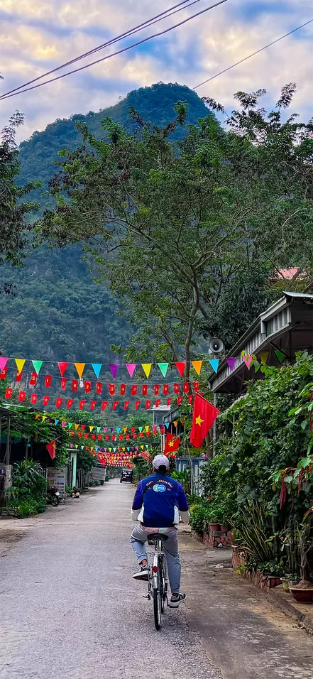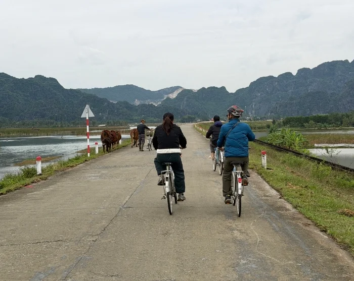 Efter frukosten åker du mot distriktet Gia Vien, där dagens cirka 14 km långa cykeltur börjar. Här sätter du dig i sadeln och cyklar i lugnt tempo längs små vägar förbi gröna risfält och lokala byar på väg mot naturreservatet Van Long. Under vägen finns tid för fotostopp, bland annat vid en lokal katolsk kyrka, innan rutten fortsätter genom det öppna landskapet. Området kring Van Long är känt för sina stilla våtmarker, karaktäristiska kalkstensklippor och rika fågelliv – en vacker inramning för dagens tur.