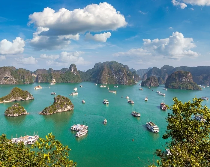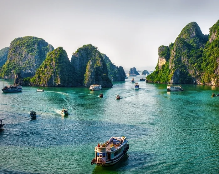 Ha Long-bukten är ett av Vietnams mest fascinerande naturområden. Här reser sig hundratals grönklädda kalkstensklippor rakt upp ur havet, som under årets lopp skiftar färg från djupblå till jadegrön. På den största ön, Cat Ba, ligger flera byar, medan några av de mindre öarna rymmer små fiskesamhällen. För resenärer är Ha Long-bukten framför allt ett storslaget naturområde i världsklass, men för vietnameserna är det också en plats fylld av sägner om drakar och dramatik. Bukten täcker ett område på cirka 1 500 km² och blev upptagen på UNESCOs världsarvslista år 1994.